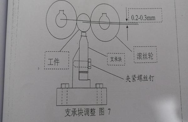 松开加紧螺丝钉,调整支撑块前端面与滚丝轮的前端面位于同一平面内,工件中心低于主轴中心0.2-0.3mm,实际操作滚压时以工件不刮丝、不上跳为最佳