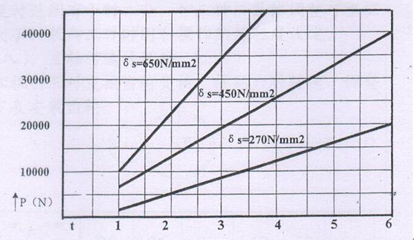 上表P、t曲线共三条,是按材料的屈服极限βs和工件螺纹长度为10mm而绘制的其垂直坐标为滚压力P(单位为N),水平坐标为螺距t(单位是mm)